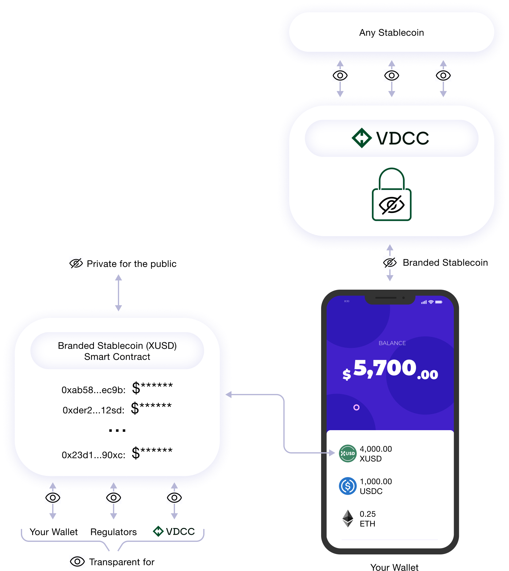 Private stablecoin balances: User A holds $10M USDC in their wallet but fears it might be tagged and monitored. They can instantly convert their $10M to your branded stablecoin (e.g., XUSD) for a $10 fee. Once transferred, all public blockchain balances are encrypted, making them unreadable without a decryption key.